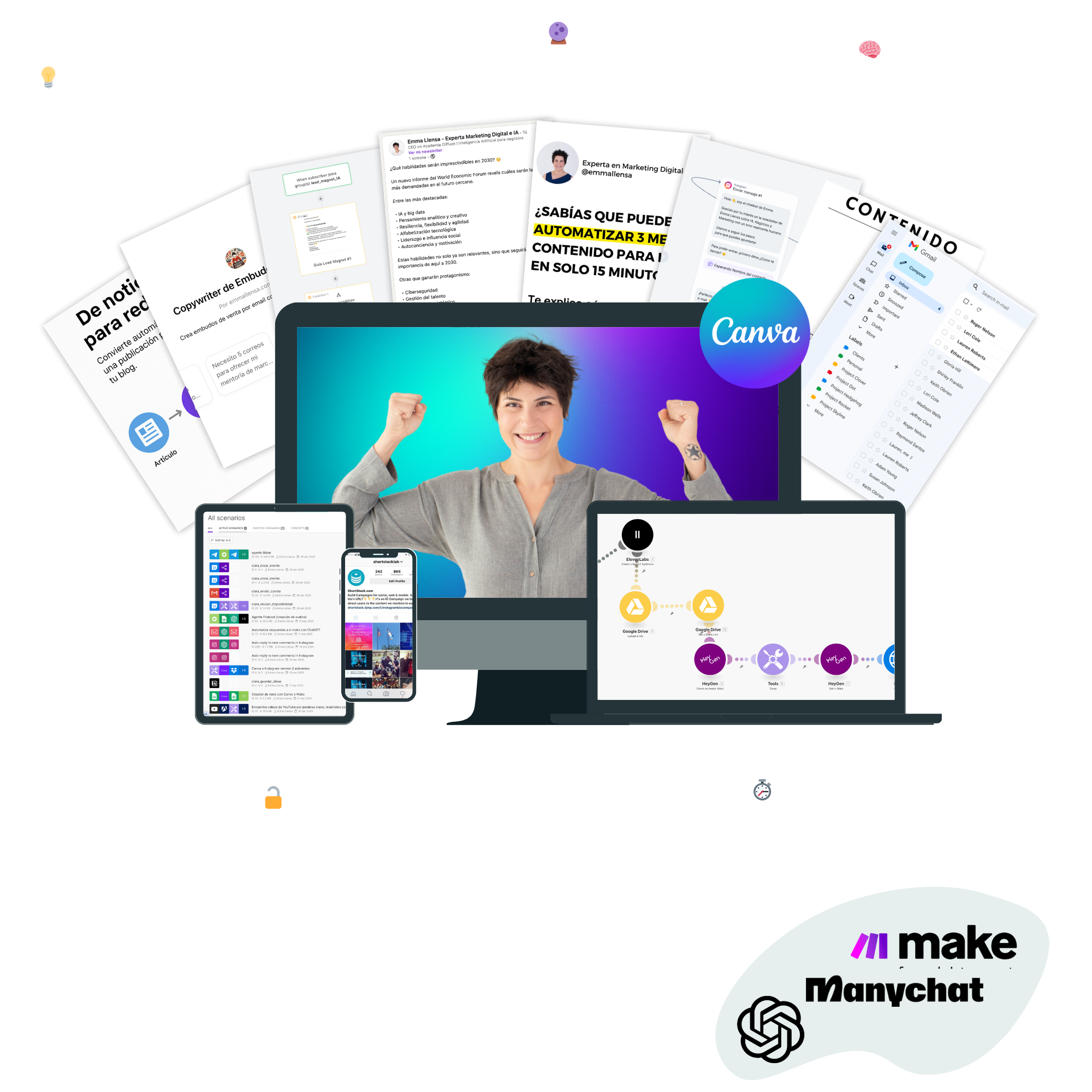 En este curso aprenderás a crear sistemas reales basados en IA y Make que publican por ti, organizan por ti, analizan por ti y te quitan de encima tareas repetitivas que ahora mismo te frenan. No hablamos de teoría: hablamos de sistemas que funcionan solos.